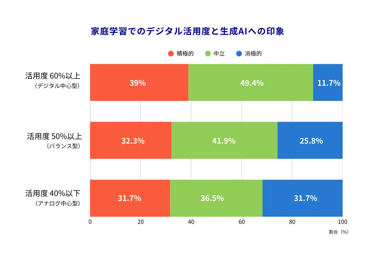 家庭学習の60%以上をデジタル教材で行っている「デジタル中心型」の家庭では、約39.0%が生成AIに「積極的」な印象を持っていて、「消極的」としたのは11.7%にとどまる一方、デジタル教材の活用が40%以下の「アナログ中心型」の家庭では、「積極的」も「消極的」も同じく約31.7%で、生成AIに対して慎重な姿勢が見られ、デジタルとアナログを半々で活用する「バランス型」の家庭では、明確な傾向が出にくく、判断が分かれた。