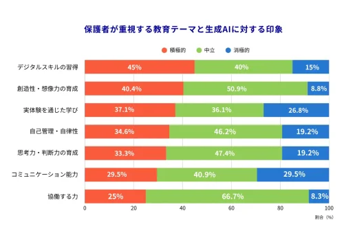 一方、「子どもの学びや成長にマイナスの影響を与えそうで心配している」「どのような影響があるか具体的にイメージできず、不安を感じる」といった消極的な意見も7.6%程度あり、保護者のあいだで捉え方に幅がある。
