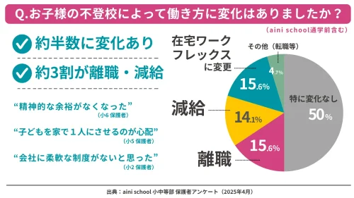 それによると、「子どもの不登校によって働き方に変化はあったか」と尋ねたところ、「離職」(退職・休職を含む)が15.6%、「減給」(時短・残業調整など)が14.1%、「在宅・フレックス勤務に変更」が15.6%という結果になり、保護者の約3人に1人(29.7%)が、「子どもの不登校をきっかけに離職または減給を経験した」と回答した。