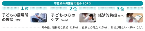 一方、不登校の子どもを持つ保護者に「直面する悩み」を聞いたところ、1位「子どもの居場所の確保」29.3%、2位「心のケア」19.5%、3位「経済的負担」17.2%、4位「精神的な負担」12.6%、5位「仕事との両立」12.1%、6位「外出が難しい」7.5%となった。