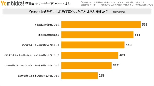 「Yomokka!」の利用頻度が高い児童ほど、良い変化があったと回答する割合が高く、「Yomokka!」を「ほぼ毎日使った」と答えた295人のうち「本を読む時間が増えた」を選んだ児童はおよそ6割にあたる175人だった。また、「これまであまり本を読まなかったが、本を読むようになった」と回答した児童は全体で357人おり、不読率の改善の効果もうかがえた。