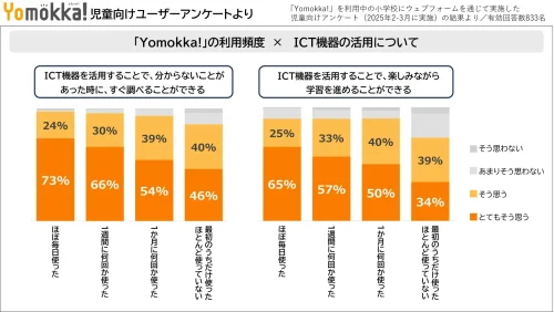4年生以上の児童を対象にICT機器の利用に関するアンケート項目を設けた。ICT機器の利用によって学習に良い効果があらわれていると感じているか、7つのアンケート項目を設けたところ、全ての項目において「Yomokka!」の利用頻度が高い児童ほど良い効果を感じていると答える傾向が見られた。