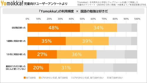 「国語の勉強は好きだ」という項目に対する回答と「Yomokka!」利用頻度の間にも相関関係が見られた。「Yomokka!」を「ほぼ毎日使った」と回答した児童の80%以上が、「国語の勉強は好きだ」の質問に対して「当てはまる」「どちらかといえば、当てはまる」と肯定的な回答を選択したのに対し、「Yomokka!」を「最初のうちだけ使った」「ほとんど使っていない」と答えた児童において肯定的な回答は約50%にとどまった。