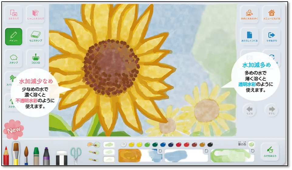 半透明水彩調は、従来の「アクリル調」に加え、学童用絵の具を再現したもので、半透明水彩調の絵の具は、溶く水加減で透明調にも不透明調にも使うことができ、絵画など様々な創作をする図工の授業や学習外の表現活動にも利活用できる絵の具機能。
