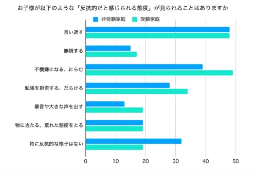 その結果、受験家庭は非受験家庭に比べて生活・心理面での負荷が明らかに大きいにもかかわらず、子どもの反抗的態度の出現率の差は想定より少ないことが明らかとなり、「受験=反抗的になる」という通説に一石を投じる結果となった。