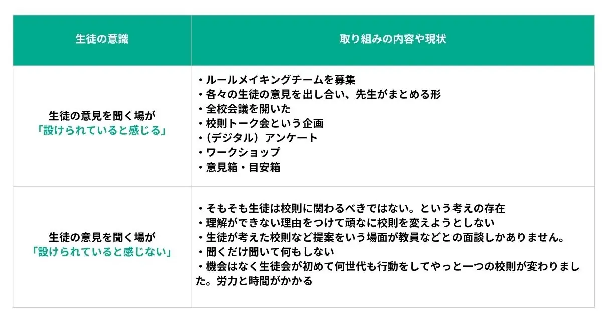 すなわち、「人員配置や異動の問題」「風紀上の懸念」「慣習」、学校のシステムや根付いている文化などから、生徒の声を聞く場を設けるということが単純な話ではないという実態が浮き彫りになった。