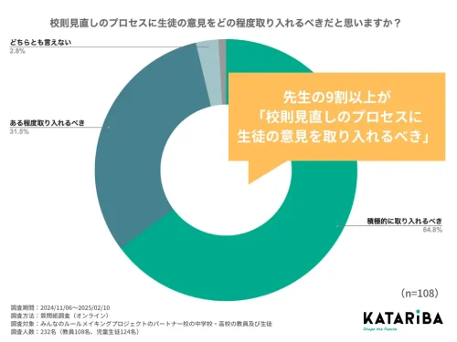 一方、教員側の結果をみると、「校則見直しのプロセスに生徒の意見をどの程度取り入れるべきだと思うか」との質問に、教員の9割以上が「生徒の意見を取り入れるべき」と回答している。