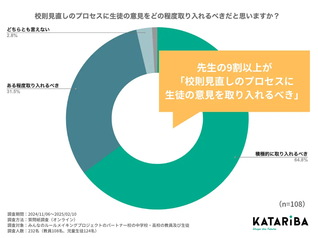 カタリバは27日、校則見直し(ルールメイキング)に取り組む全国の中学・高校の生徒と教員計232人を対象に実施した、「何が校則見直しの進度の差を分けるのか?」その実態を明らかにする調査の結果をまとめ発表した。