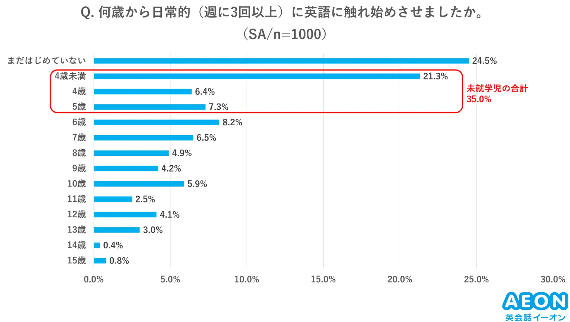 調査は、4歳~15歳の子どもを持つ保護者1000名を対象に6月13日~16日に行われた。それによると、子どもを英語に触れ始めさせた時期は「4歳未満」が最多となり、約3分の1が未就学児から英語学習を開始したと答えた。