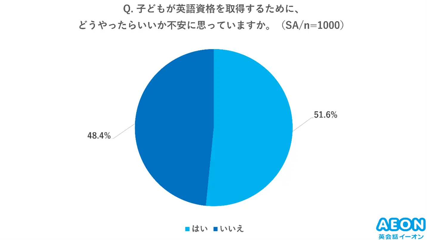 子どもにとって英語資格試験が大切だと感じている保護者が約7割を占めた一方で、英語資格未取得の子どもを持つ保護者も7割以上に上った。また、半数以上の保護者が英語資格の学習方法に不安を感じていると回答した。