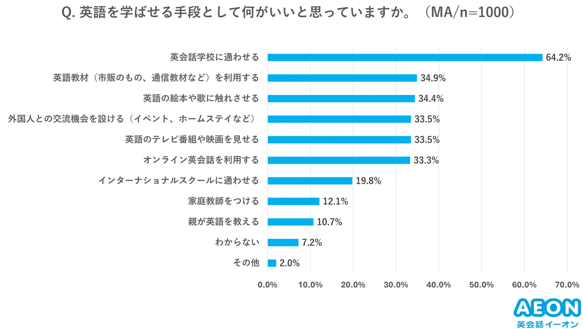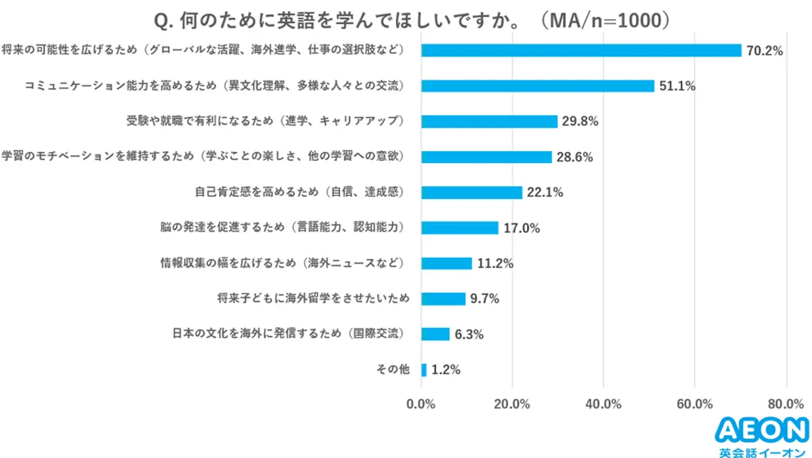 子どもに何のために英語を学んでほしいかを訊ねたところ、「将来の可能性を広げるため」が1位で70%以上となった。