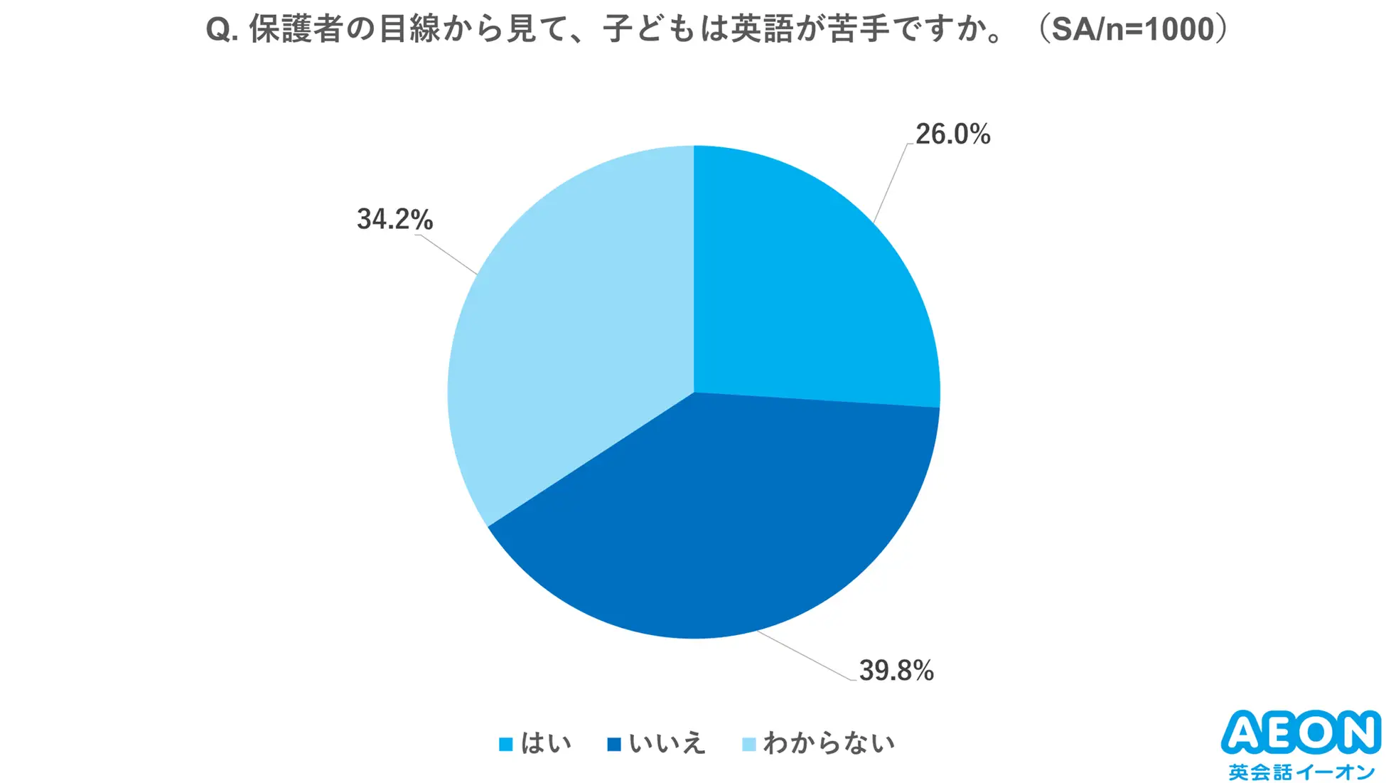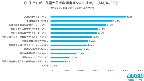 自分の子どもは英語が苦手と感じている保護者は4分の1以上に上った。その理由は1位「文法が理解できていない」50.4%、2位「単語を覚えるのが苦手」41.5%、3位「英語を聞き取るのが苦手」37.3%などとなった。