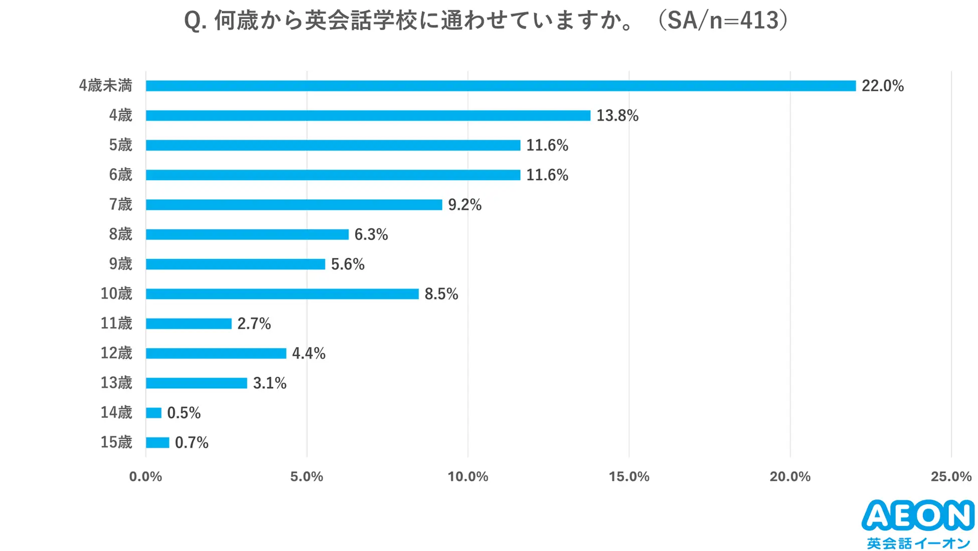「英会話学校に通わせたい」と回答した保護者は6割以上に上り、実際に子どもを英会話学校に通わせている保護者は4割以上、そのうち4歳未満から通学させている保護者が最多となった。