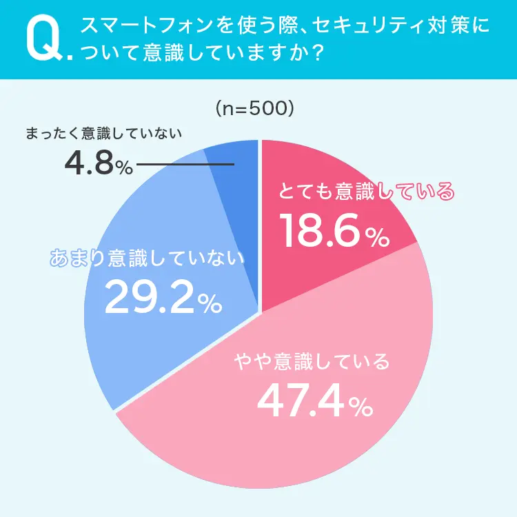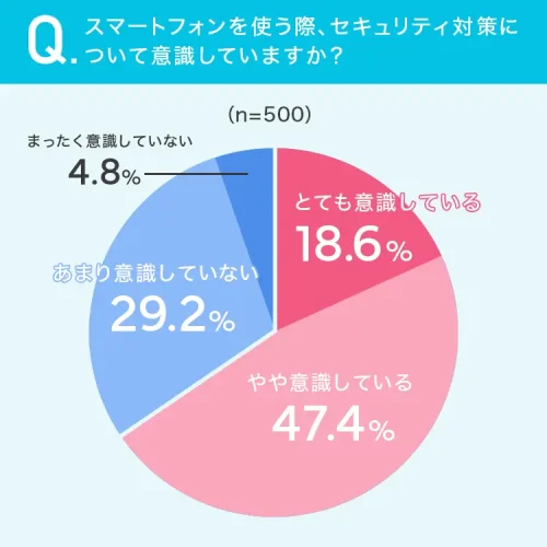 「スマートフォンを使う際、セキュリティ対策について意識していますか?」の問いには、「とても意識している」が18.6%。「やや意識している」が47.4%。合計で66%と半数以上がセキュリティ対策について「意識している」。
