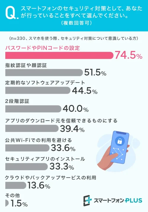 「スマートフォンのセキュリティ対策として、行っていること」は、「パスワードやPINコードの設定」が74.5%で最多。「指紋認証や顔認証」が51.5%。「定期的なソフトウェアアップデート」が44.5%と続いた。