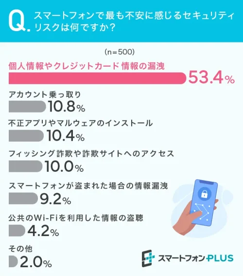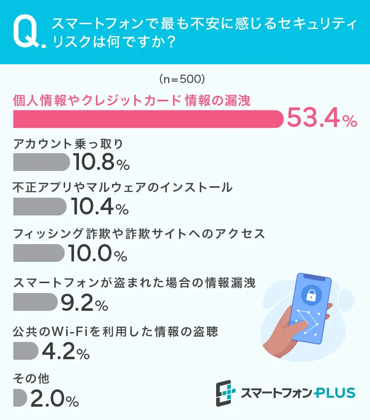 「スマートフォンで最も不安に感じるセキュリティリスクは何か」については、「「個人情報やクレジットカード情報の漏洩」が最多の53.4%。「アカウント乗っ取り」が10.8%。「不正アプリやマルウェアのインストール」が10.4%と続いた。