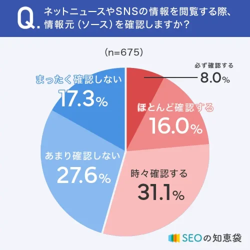「ネットニュースやSNSの情報を閲覧する際、情報元(ソース)を確認しますか?」の問いに、「まったく確認しない」が17.3%。「あまり確認しない」が27.6%で、合計44.9%が「情報元(ソース)をあまり・まったく確認しない」。