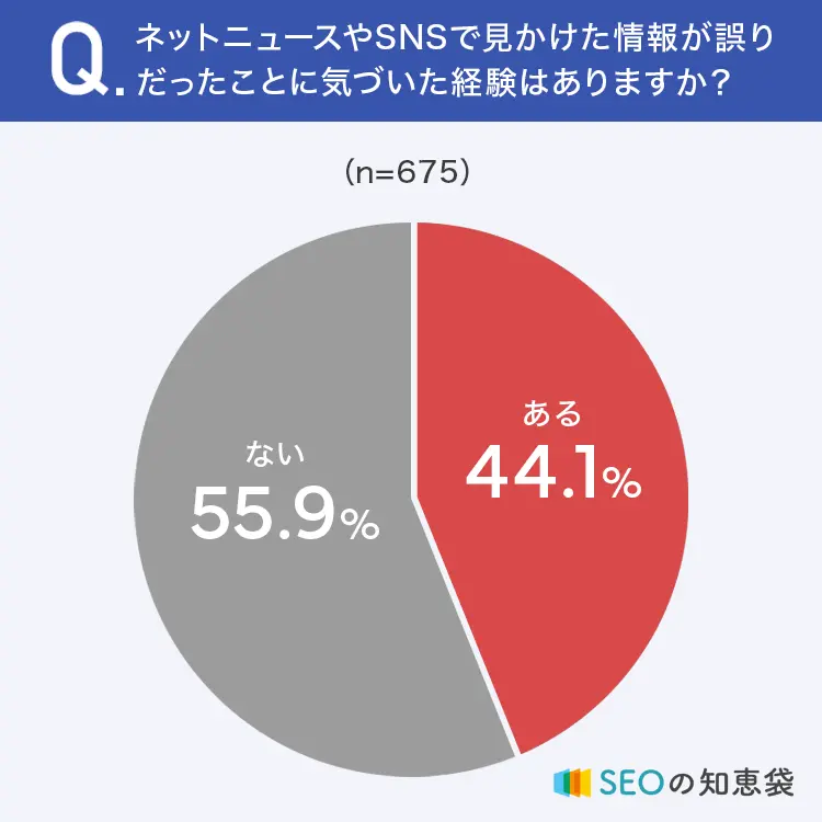 「ネットニュースやSNSで見かけた情報が誤りだったことに気づいた経験はあるか」の問いには、44.1%と半数近くが「ある」と回答した。