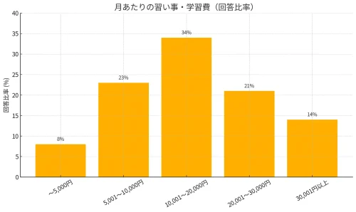 その結果、月あたりの平均学習費は1万7175円だった。中でも34%が「10,001~20,000円」に集中し“1~2万円前後”がボリュームゾーンとなった。