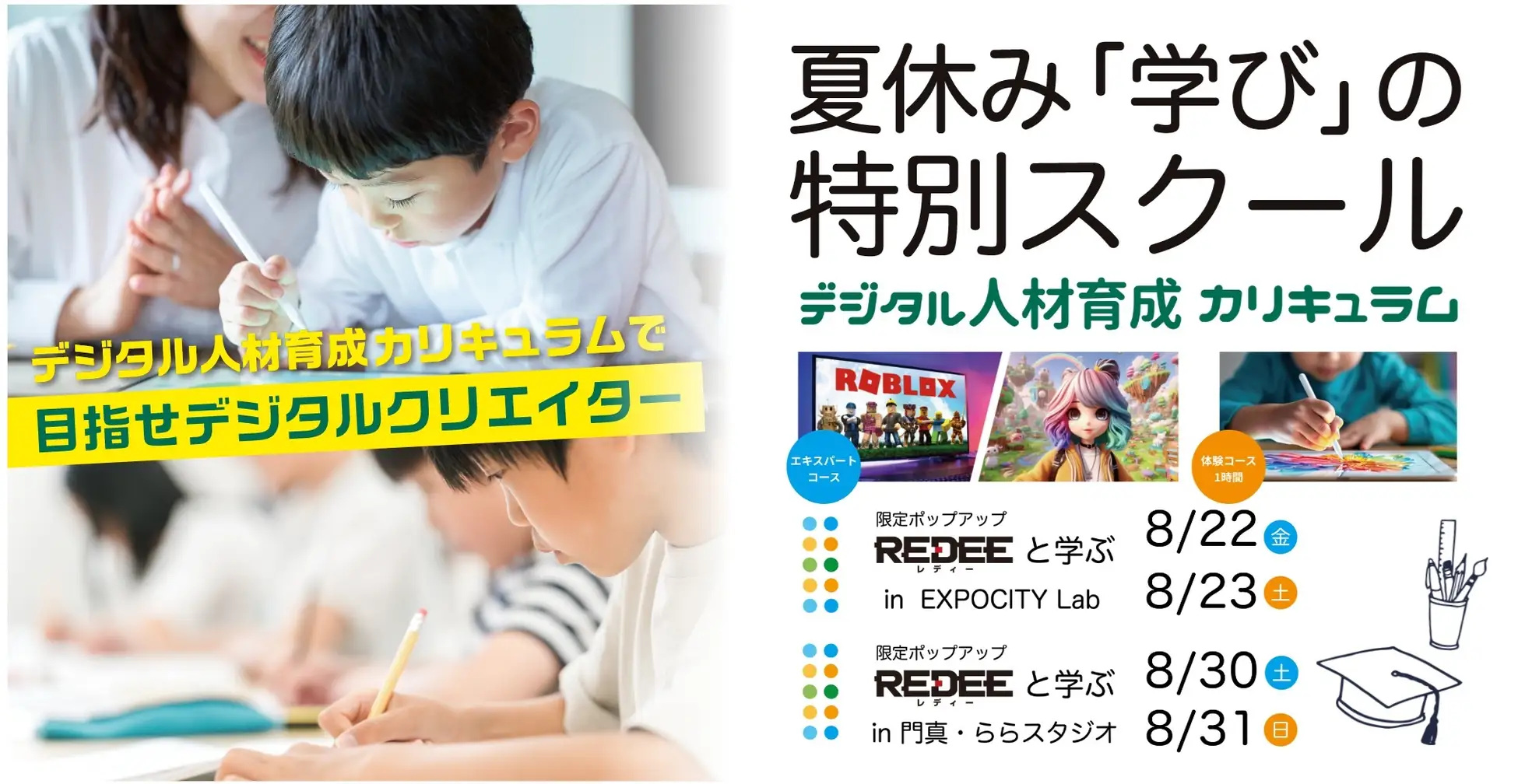 REDEE(レディー)は、デジタル人材育成カリキュラムの一環として、ららぽーとEXPOCITY店とららぽーと門真店にて8月22日・23日・30日・31日に「夏休み学びの特別スクール」を開催する。
