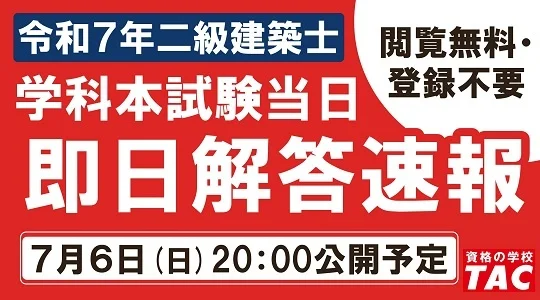 TAC、「令和7年 二級建築士(学科試験)」の「解答速報」を試験当日6日20時公開