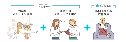 さとのば大学は、日本全国4つの地域に1年ずつ暮らしながら、自分で立てたテーマに現地の人々と共に取り組む「プロジェクト学習」と、地域共創領域で活躍する講師陣や在校生と学び合う「オンライン学習」を行き来しながら学ぶ大学。