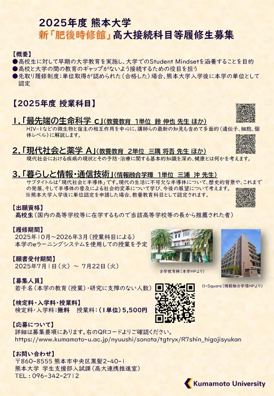 国立・熊本大学は、今年度から高校生を対象とした新「肥後時修館」(高大接続科目等履修生)を開講するのに伴い、その受講生を7月22日まで募集している。