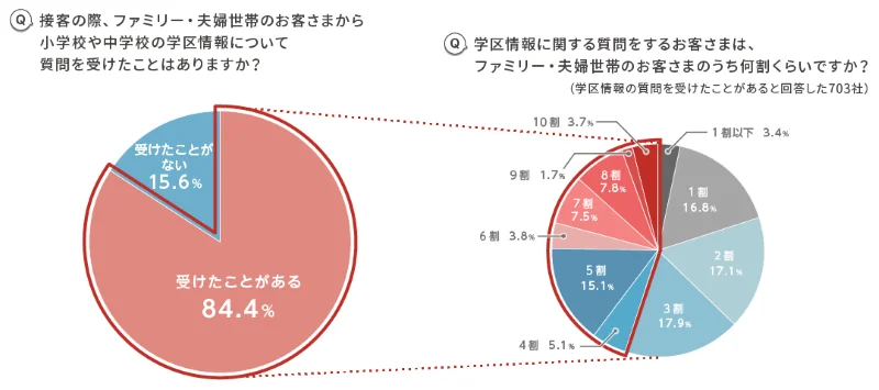 調査はアットホームに加盟する全国の不動産会社831社を対象に、4月22日~30日に行われた。それによると、小学校や中学校の学区情報について質問を「受けたことがある」と回答した不動産会社が8割以上に上った。受けたことがあると回答した不動産会社のうち約4割が、ファミリーや夫婦世帯のうち5割~10割の人が学区について質問すると回答した。