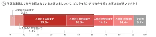学区を重視しているファミリー・夫婦世帯が物件を探すタイミングについて訊ねたところ、「入学の1年前まで」が最多の約3割に上り、「入学の6カ月前まで」と合わせて約半数となった。