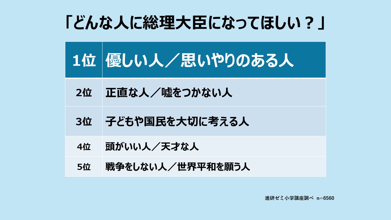 また、「総理大臣に求める人物像」について聞いたところ、「優しい人」「嘘をつかない人」「みんなのことを考えてくれる人」という自由回答が上位を占め、子どもたちは「頼れる人格」に重きを置いていることが分かった。