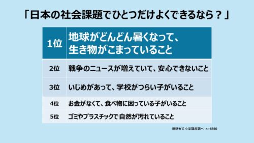 最後に、「日本の社会課題の中で、1つだけよくできるとしたら?」と聞いたところ、最も関心が高かったのは「地球温暖化や環境の問題」で、次いで「戦争の不安」、「いじめ」など、子どもたち自身が感じる不安や違和感に関わるものが挙げられた。「貧困」や「少子化」などの社会構造に関心を寄せる声もあり、社会課題を自分の生活に引き寄せて捉える姿が見られた。