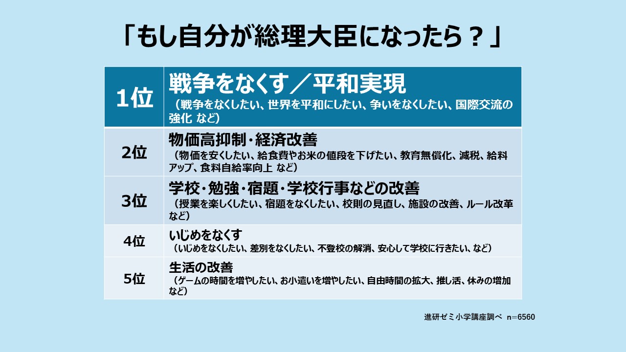 「もし自分が総理大臣になったら?」と尋ねたところ、「戦争をなくす」「平和な世界にしたい」など、戦争や平和実現に関連する自由回答が約4割で最も多かった。次いで、「物価を下げる」「教育を無償に」など、生活や経済を良くしたいという声も多く寄せられた。