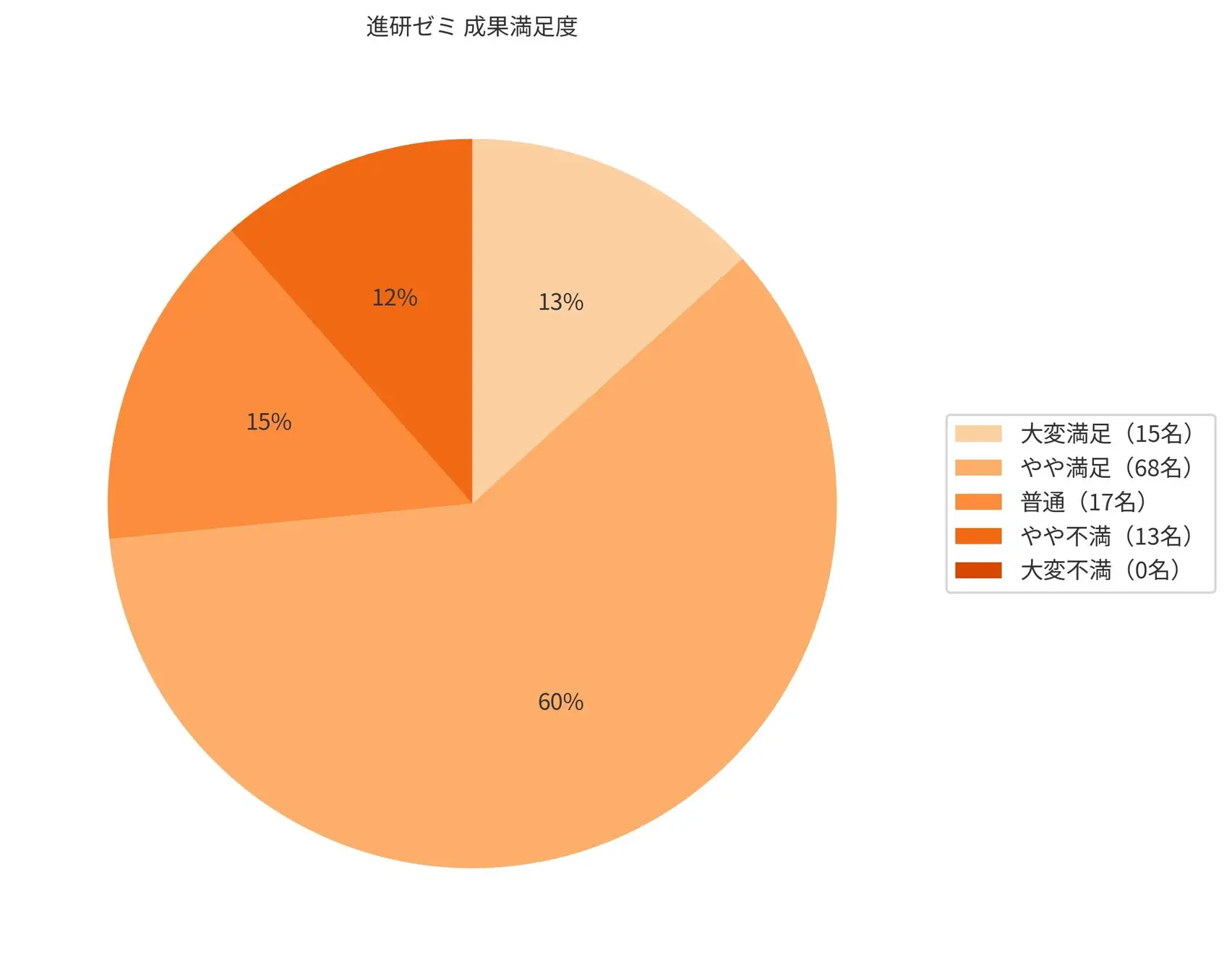 こどもちゃれんじ(ベネッセ進研ゼミ)利用者113名へのアンケートでは、「大変満足」が15名(13%)、「やや満足」が68名(60%)、「普通」が17名(15%)、「やや不満」が13名(12%)、「大変不満」が0名で、70%以上が「満足」、もしくは「やや満足」と回答している。