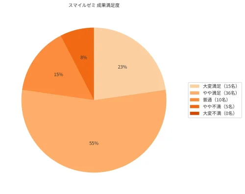 スマイルゼミ利用者66名へのアンケートでは、「大変満足」が15名(23%)、「やや満足」が36名(55%)、「普通」が10名(15%)、「やや不満」が5名(8%)、「大変不満」が0名で、不満を抱えている人は8%にとどまり、75%以上が満足している。