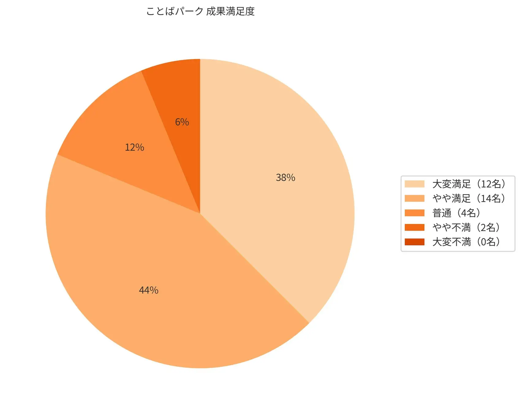 ことばパーク利用者32名へのアンケートでは、「大変満足」が12名(38%)、「やや満足」が14名(44%)、「普通」が4名(12%)、「やや不満」が2名(6%)、「大変不満」が0名で、他2つの通信教育と同様に、ほとんどの人が満足と答えているという。