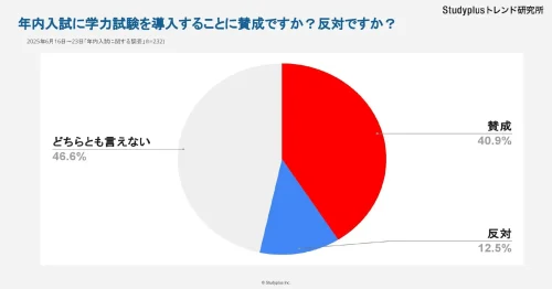 調査はStudyplusの高校3年生ユーザーを対象に6月16日~23日に行われ、232名から回答を得た。それによると、年内入試に学力試験が導入されることについて「賛成」が40.9%、「反対」12.5%、「どちらとも言えない」46.6%となった。