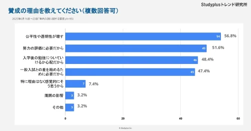 賛成の理由としては「公平性や透明性が増すから」「努力の評価に必要だから」「入学後の勉強についていけるか心配だから」「一般入試との差を縮めるのに必要だから」などが多く選択された。