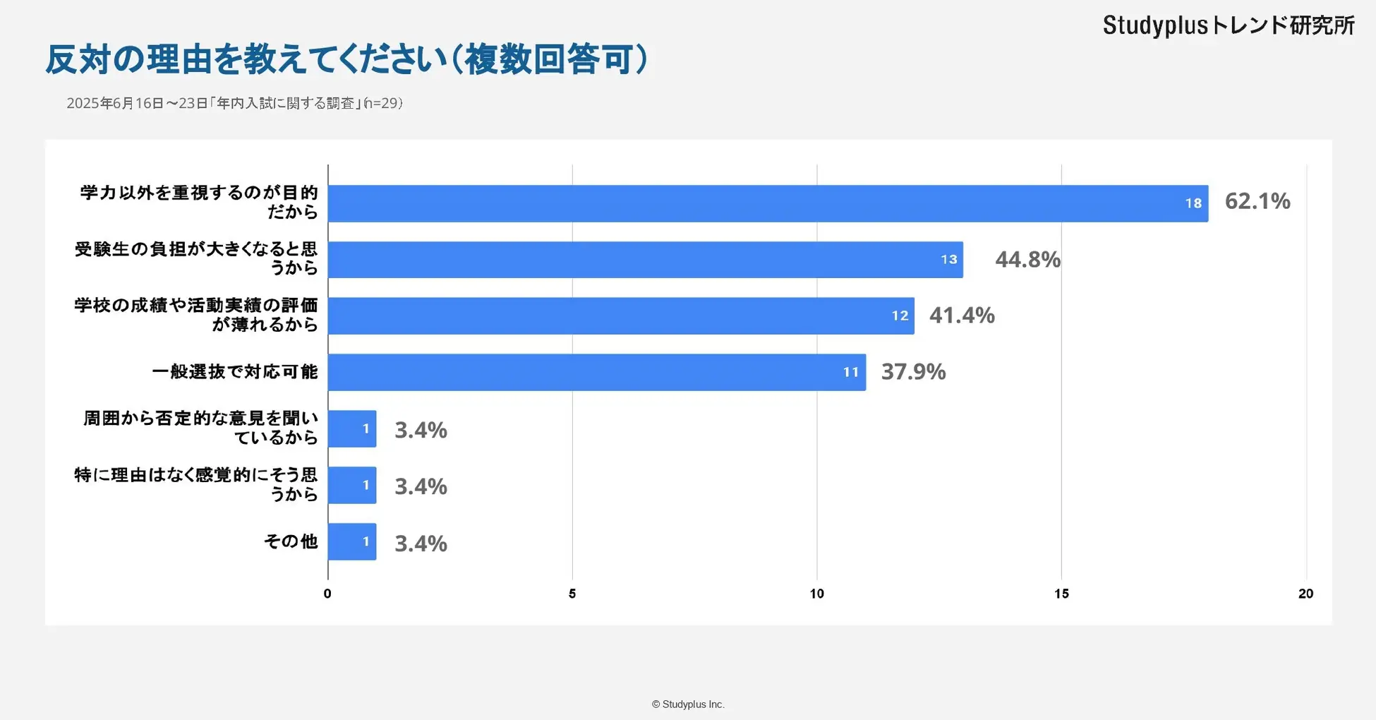 また反対の理由としては「学力以外を重視するのが年内入試の目的だから」「受験生の負担が大きくなると思うから」「学校の成績や活動実績の評価が薄れるから」などが多く選ばれた。