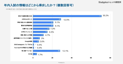 年内入試の情報源については「担任や進路指導の先生」が30.2%で最も多くなった。「学校で配られた進路資料」や「高校の進学説明会」なども多くの票を集め、年内入試に関する情報は学校を通じて取得するのが主流となっていることが分かった。