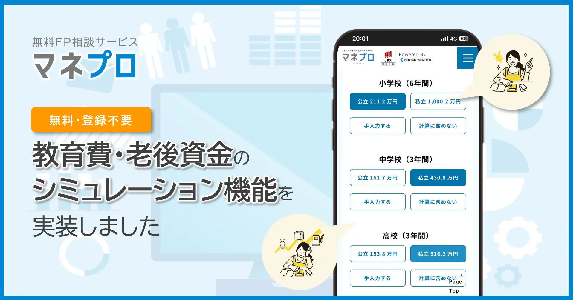 ブロードマインドは9日、FP相談サービス「マネプロ」にて、教育費・老後資金に特化したシミュレーション機能をブランドサイトに新たに追加したことを発表した。