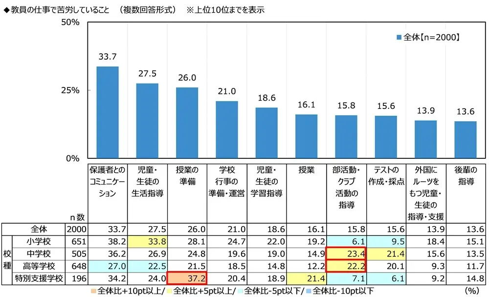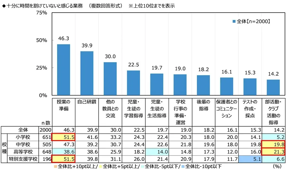 十分に時間を割けていないと感じる業務を訊ねたところ、「授業の準備」 が46.3%で最も多くなった。特に小学校と特別支援学校の教員では半数を超えており、多くの人が授業準備の時間が足りないと感じていることが分かった。教員の業務において苦労していることは「保護者とのコミュニケーション」が最も多く3人に1人となり、「児童・生徒の生活指導」「授業の準備」と続いた。仕事の悩みを相談する相手がいると回答したのは77%、女性では87%に上り、相談する相手は「同世代の教員」が最も多くなった。