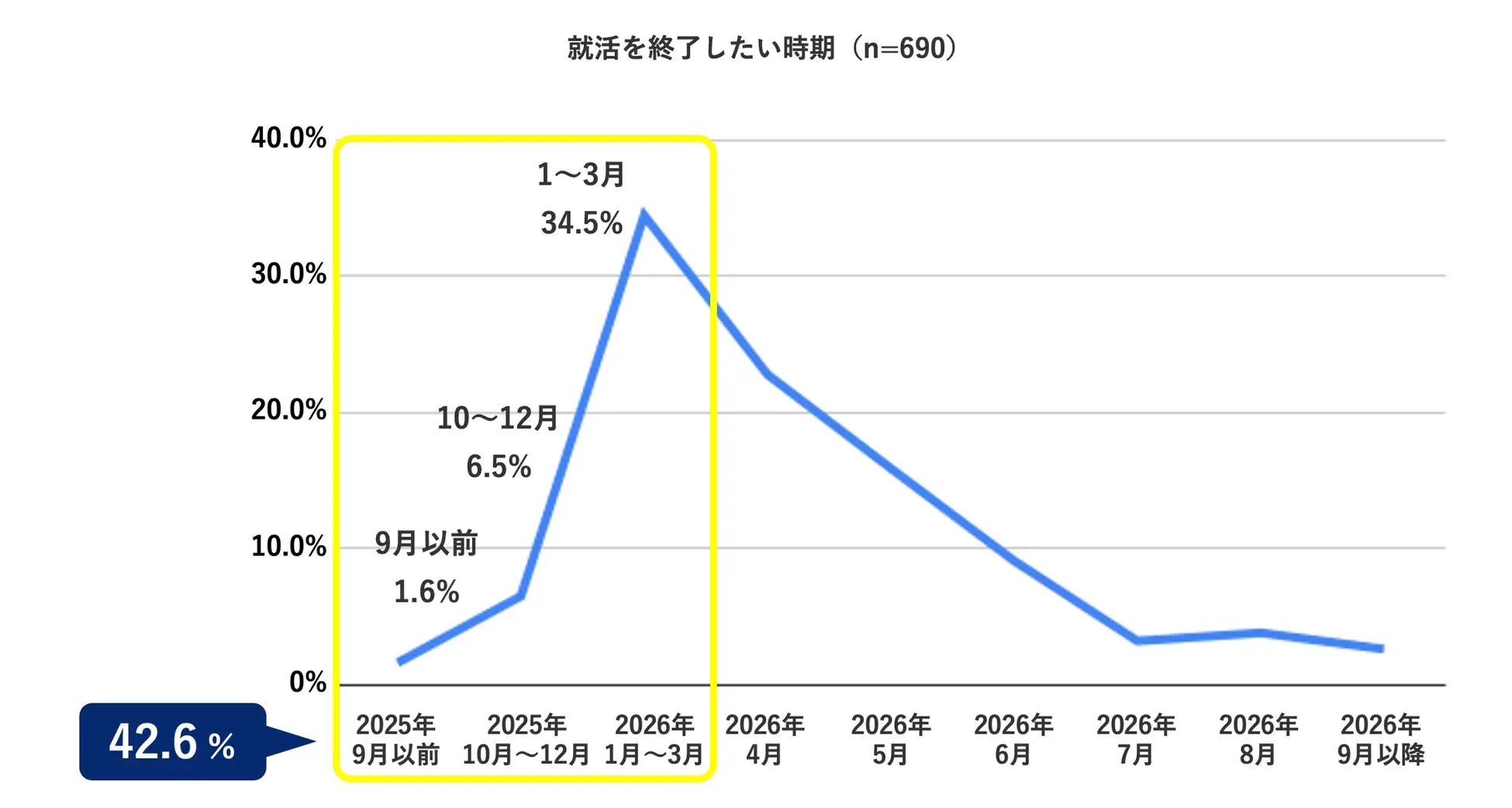 就職活動を終了したい時期については、34.5%の学生が「2026年1〜3月」と回答。「2026年1月以前」の回答を含めると、全体の42.6%が進級前に就職活動を終了したいと考えている。