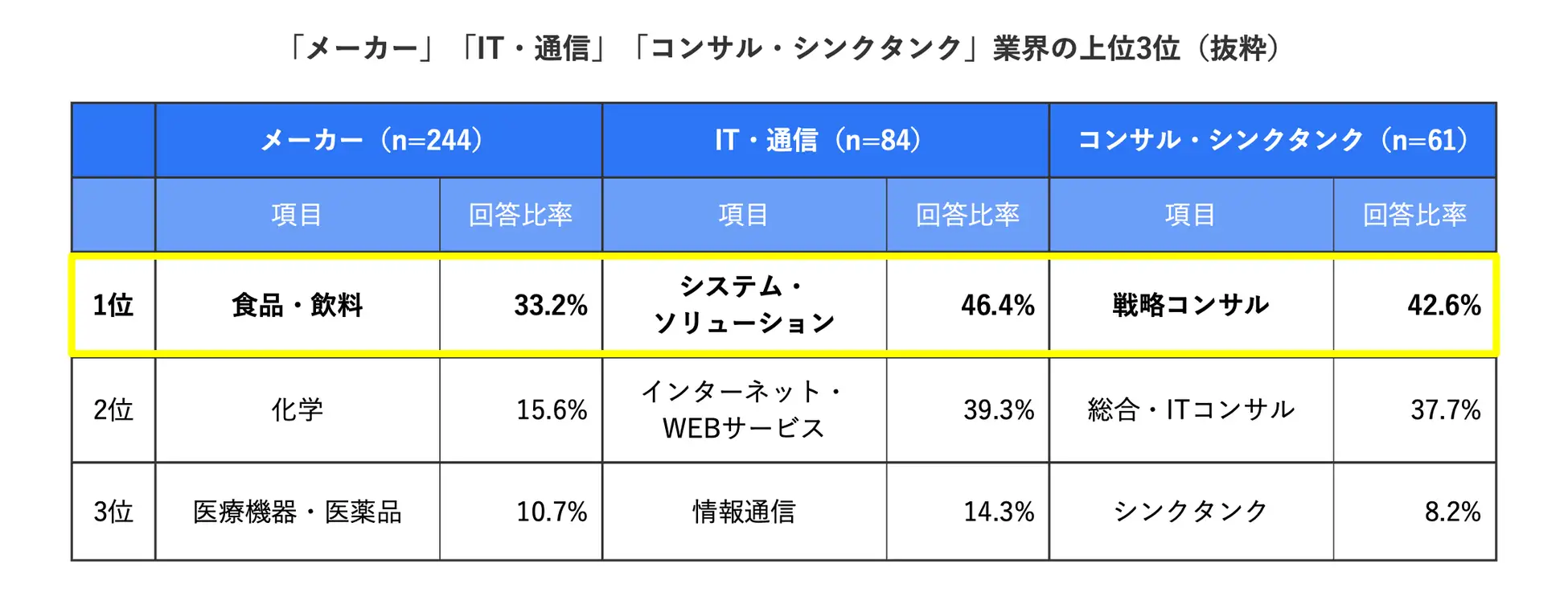「志望業界」は、「メーカー」(35.4%)が最多。次いで「IT・通信」(11.3%)、「コンサル・シンクタンク」(8.8%)。また、それぞれの業界別では、メーカーは「食品・飲料」(33.2%)、IT・通信では「システム・ソリューション」(46.4%)、コンサル・シンクタンクでは「戦略コンサル」(42.6%)がそれぞれトップとなった。