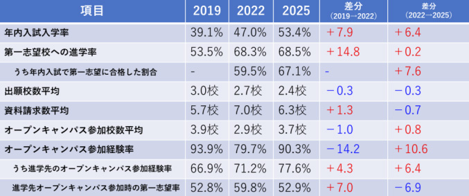 「2025年4月大学進学者の進路選択行動概況」については、 2022年と比較して、資料請求は0.68校、出願校数は0.30校減。出願校数は2回連続で減少。今年の入学者は「高校2年」時にコロナ禍が収束。3学年累計では、オープンキャンパス参加率が90.3%と、2022年比10.4ポイント上昇。2019年(93.9%)と同水準に戻る。参加校数も2019年と同程度の3.71件まで回復した。
