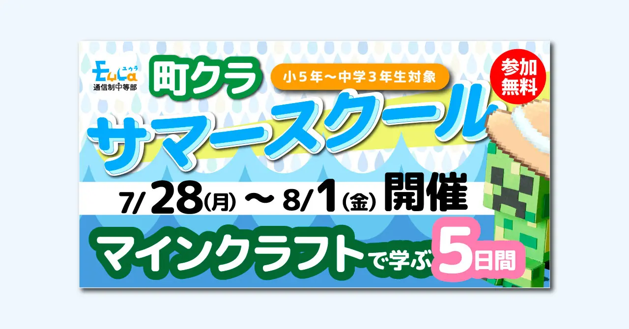 アットマーク・ラーニングは、同社が運営する「EuLa通信制中等部」の主催で、小学5年~中学3年生を対象に、マインクラフトを活用した探究型学習プログラム「町クラ」(まちクラフト)のオンライン体験会を7月28・29・30・31日、8月1日の5日間、無料開催する。