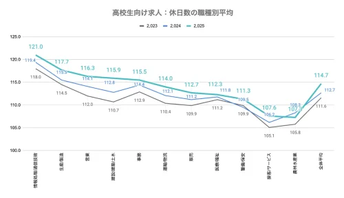 また、高校生の職場選びで重視される「休日数」は、26卒求人は全体平均で114.7日/年で、前年から2日の増加。職種別では、昨年に続き「情報・通信系」が121.0日で最も多かったが、「建設関係」も115.9日/年と、昨年から増加し改善が伺える。