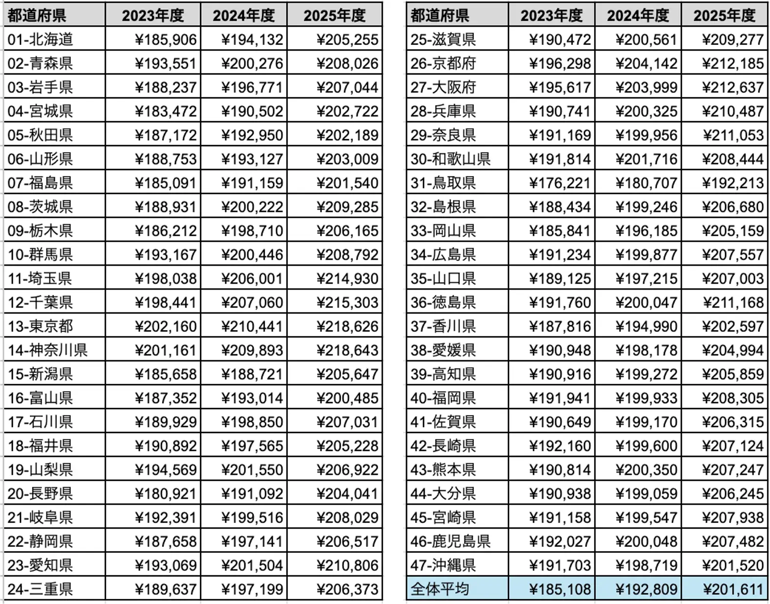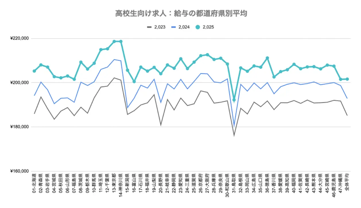 一方、都道府県別では神奈川、東京など大都市圏での高水準傾向が継続しているが、給与額は全国的に上昇傾向が続いている。また、47都道府県中46都道府県が月給20万円台に到達し、前年の17都道府県から大幅に増加。