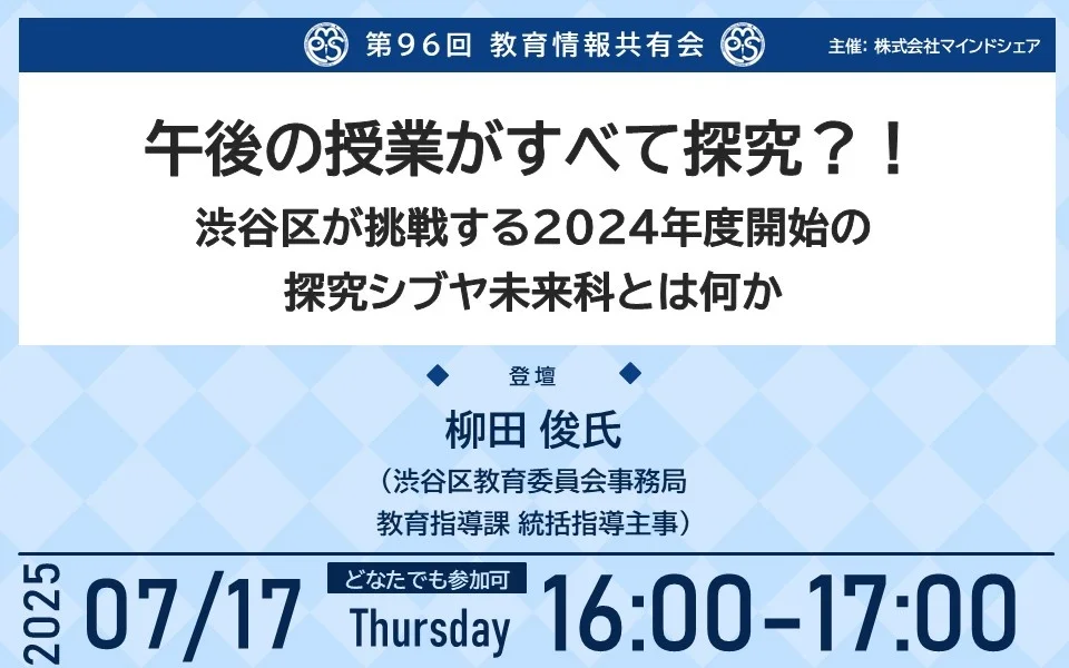 マインドシェアは、「午後の授業がすべて探究!?~東京・渋谷区が挑戦する2024年度開始の探究シブヤ未来科とは何か~」と題する、第96回「教育情報共有会」をオンラインで7月17日に無料開催する。