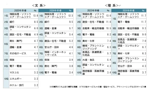 就職決定業界は文理とも「情報処理・ソフトウエア」が最多で、理系は「電子・電機」も同率1位。