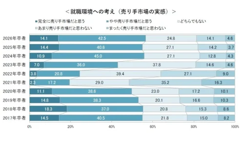就職環境が、「売り手市場だと感じる」学生は全体の56.6%で、3年連続で半数を超えた。